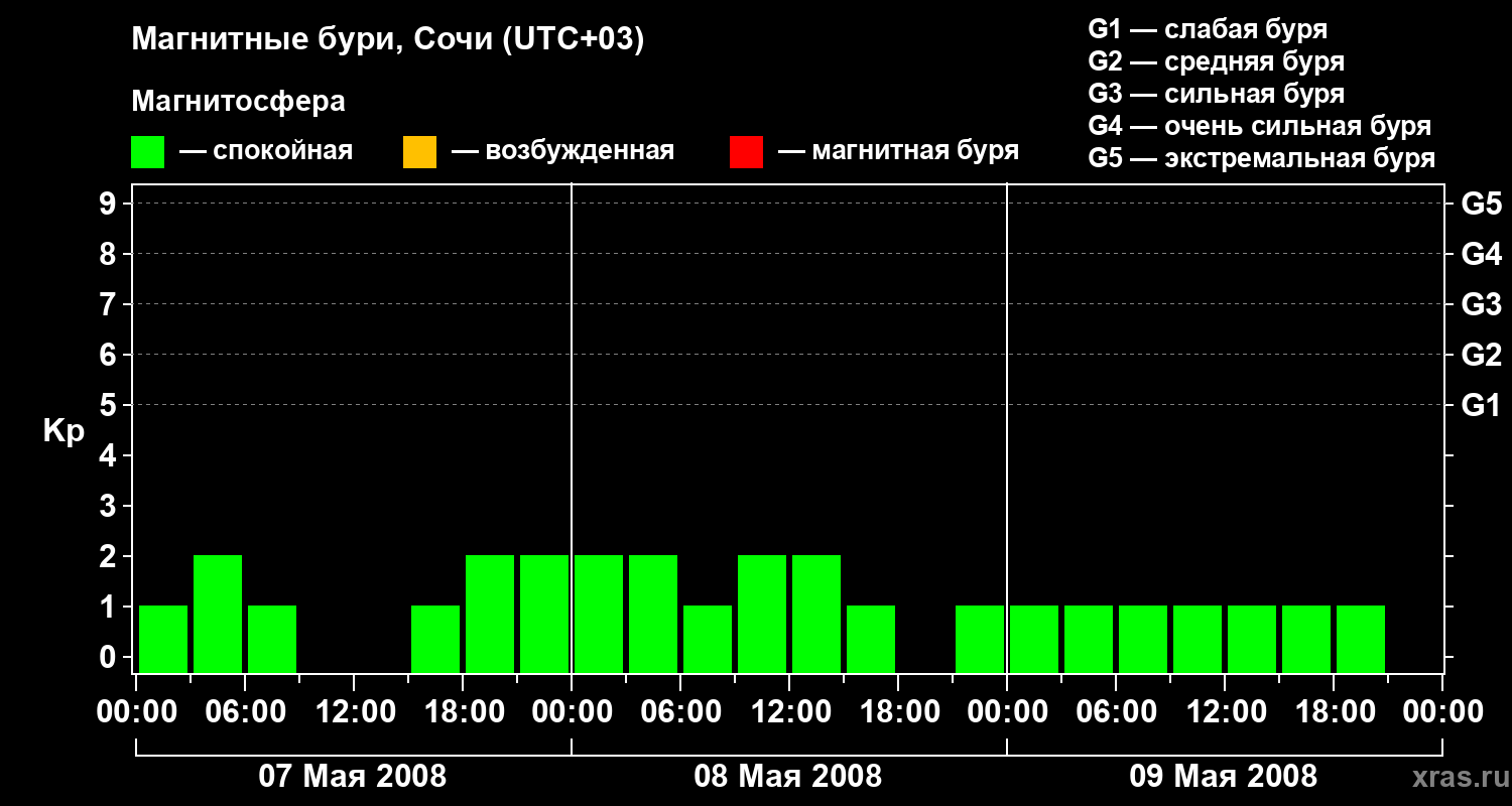 Изменения геомагнитного индекса Kp с 7 по 9 мая 2008 года для средних широт