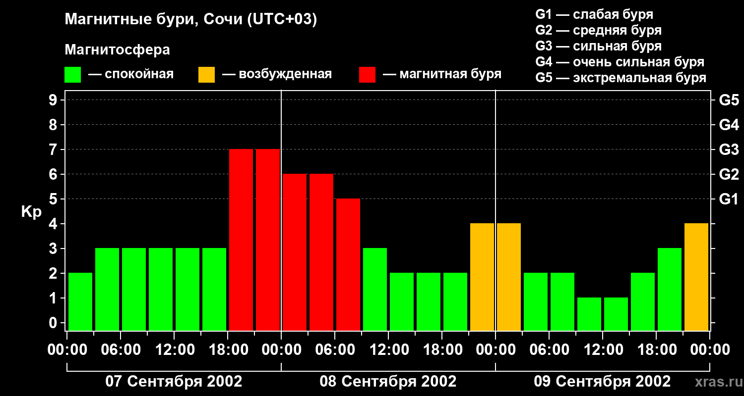 Изменения геомагнитного индекса Kp с 7 по 9 сентября 2002 года для средних широт
