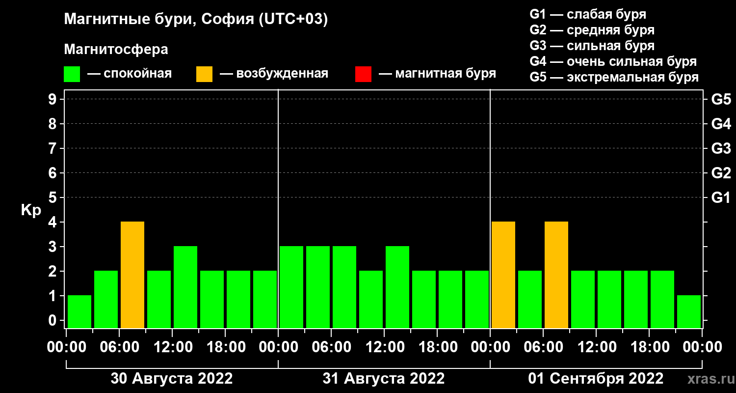 Изменения геомагнитного индекса Kp с 30 августа по 1 сентября 2022 года для средних широт