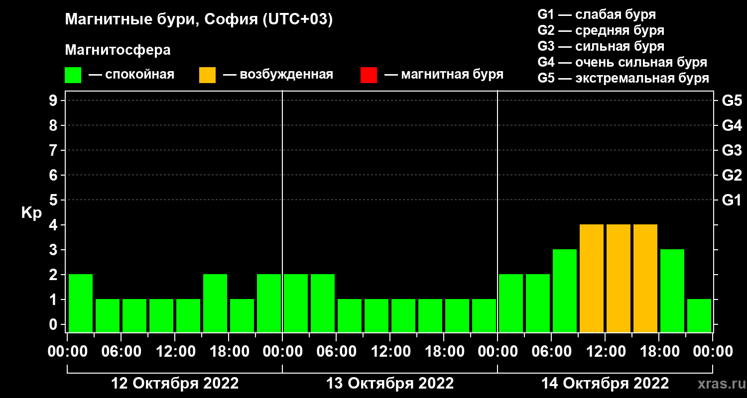 Изменения геомагнитного индекса Kp с 12 по 14 октября 2022 года для средних широт