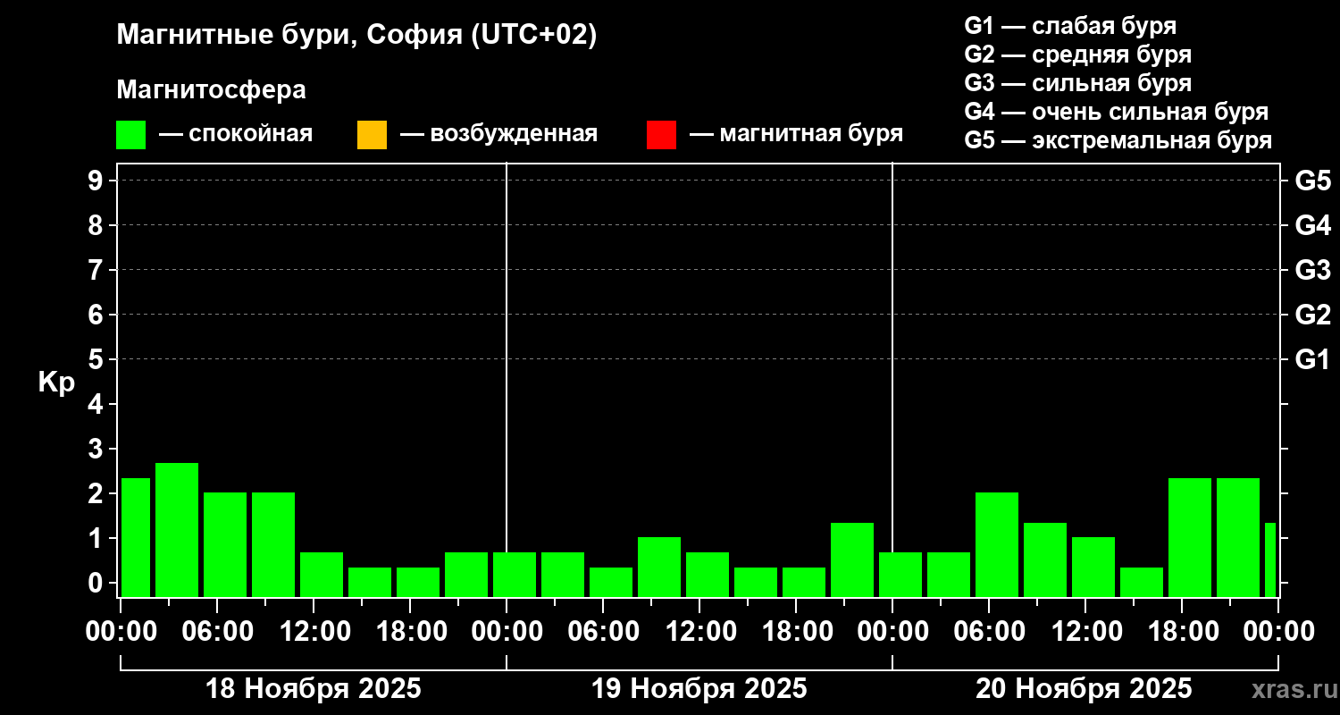 Изменения геомагнитного индекса Kp с 18 по 20 ноября 2025 года для средних широт