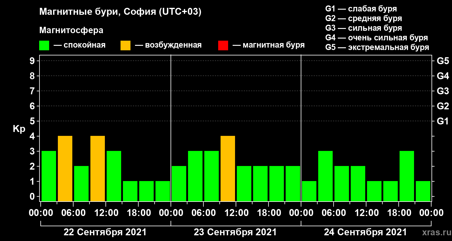 Изменения геомагнитного индекса Kp с 22 по 24 сентября 2021 года для средних широт