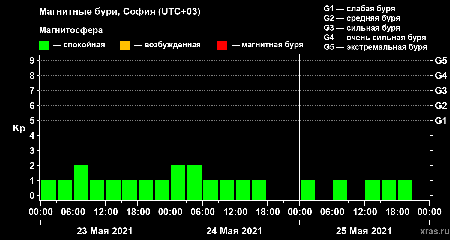 Изменения геомагнитного индекса Kp с 23 по 25 мая 2021 года для средних широт