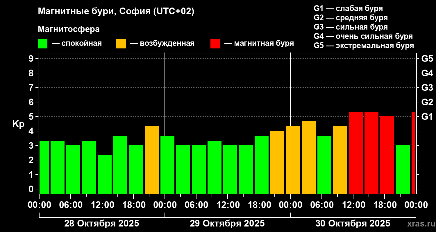 Изменения геомагнитного индекса Kp с 28 по 30 октября 2025 года для средних широт