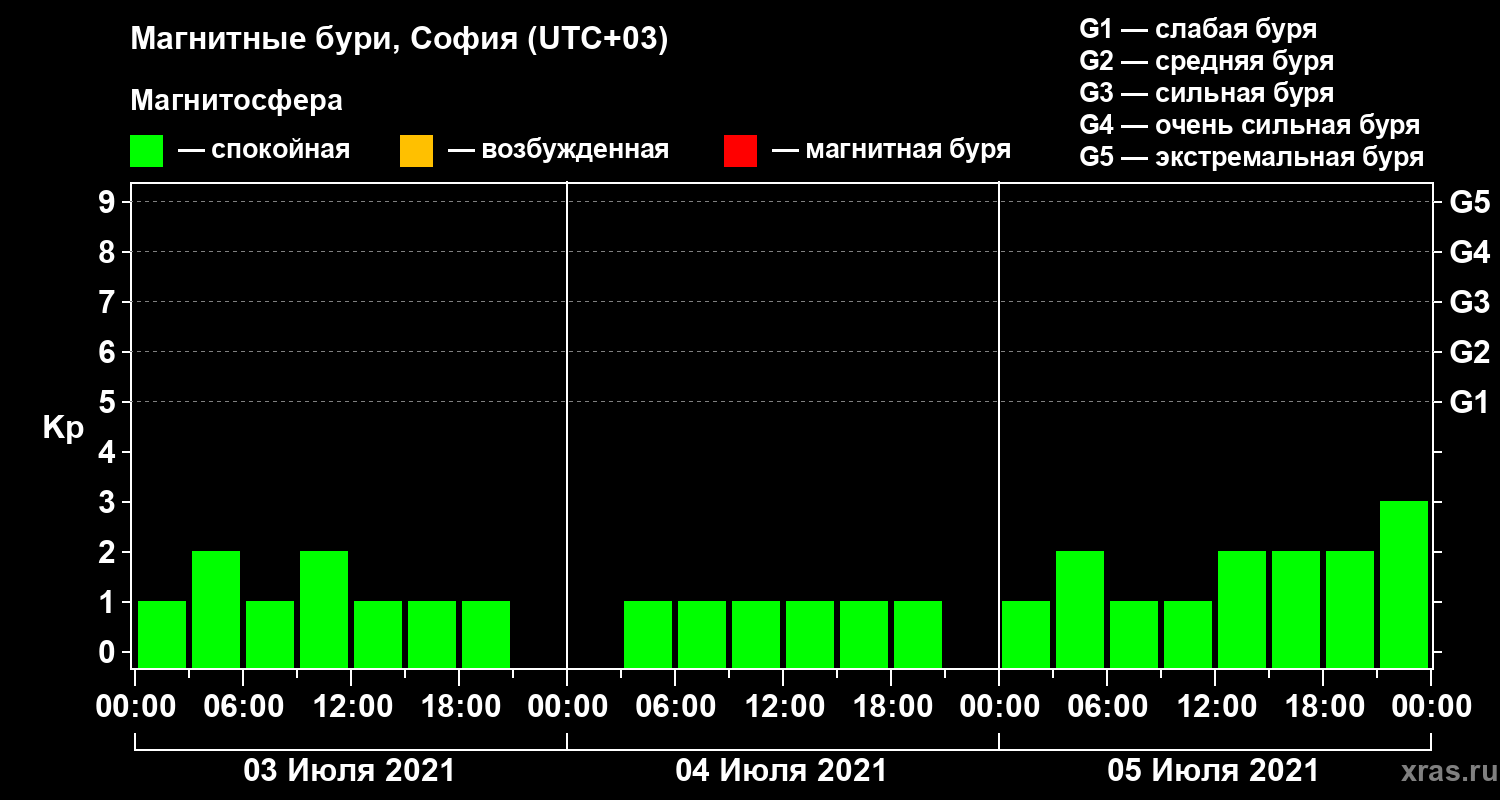 Изменения геомагнитного индекса Kp с 3 по 5 июля 2021 года для средних широт