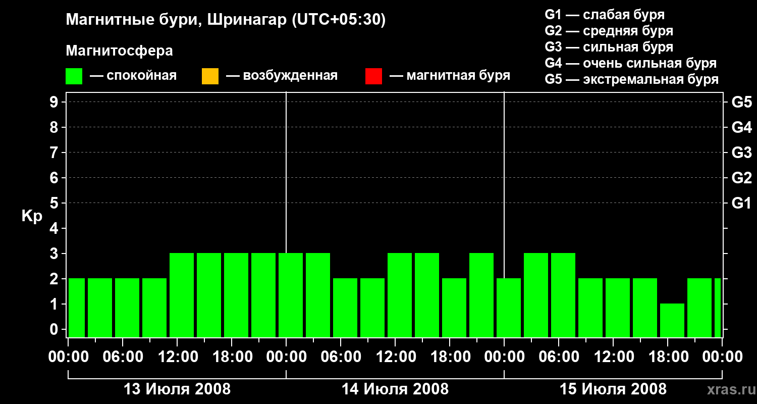 Изменения геомагнитного индекса Kp с 13 по 15 июля 2008 года для средних широт