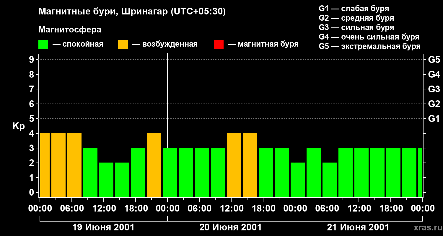 Изменения геомагнитного индекса Kp с 19 по 21 июня 2001 года для средних широт