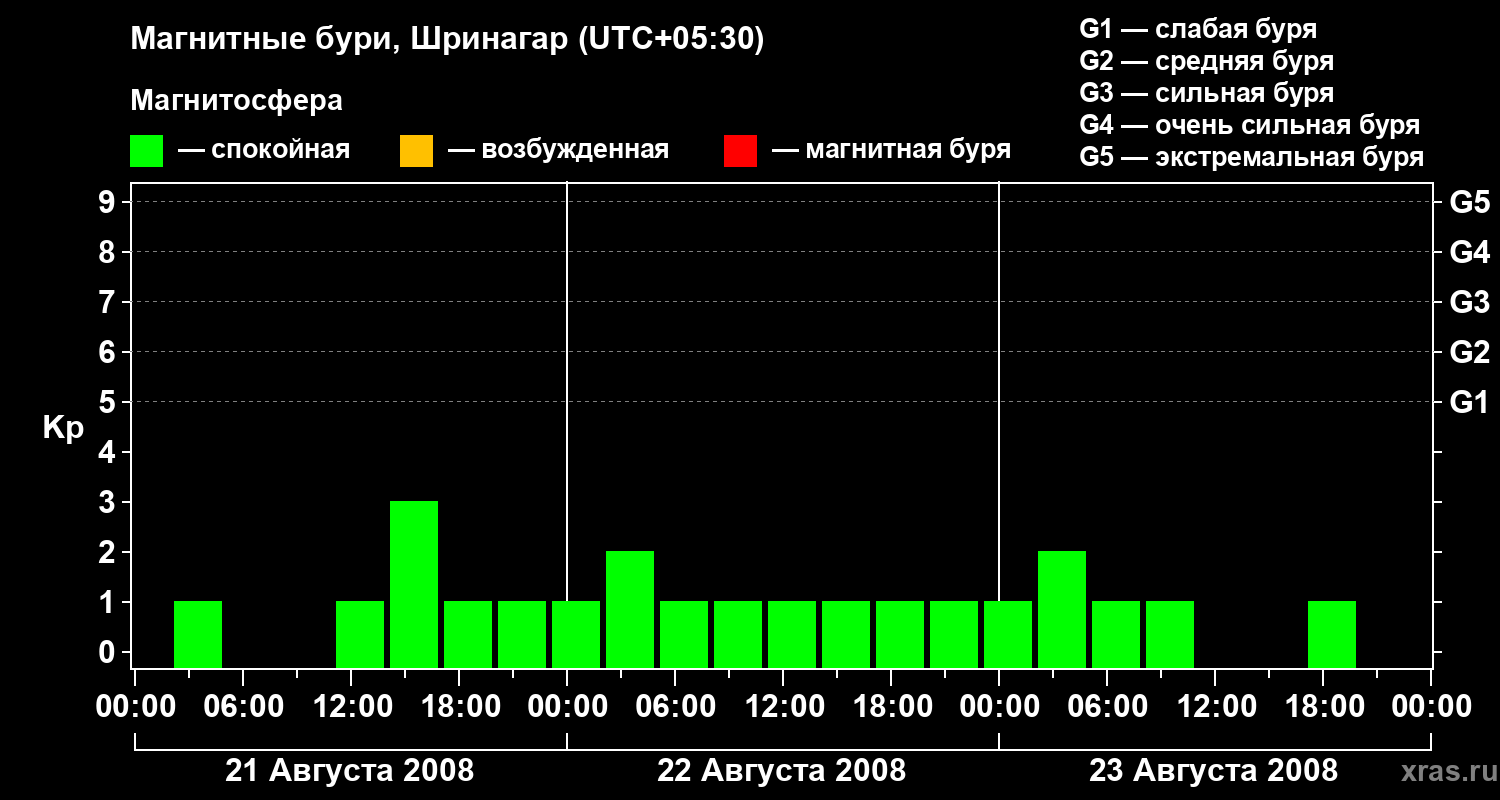 Изменения геомагнитного индекса Kp с 21 по 23 августа 2008 года для средних широт