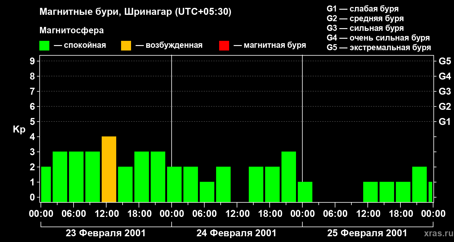 Изменения геомагнитного индекса Kp с 23 по 25 февраля 2001 года для средних широт