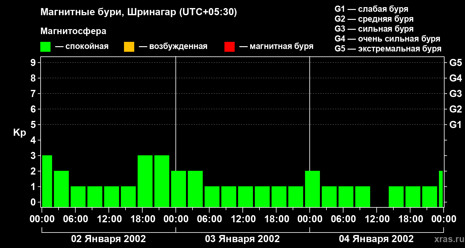 Изменения геомагнитного индекса Kp с 2 по 4 января 2002 года для средних широт