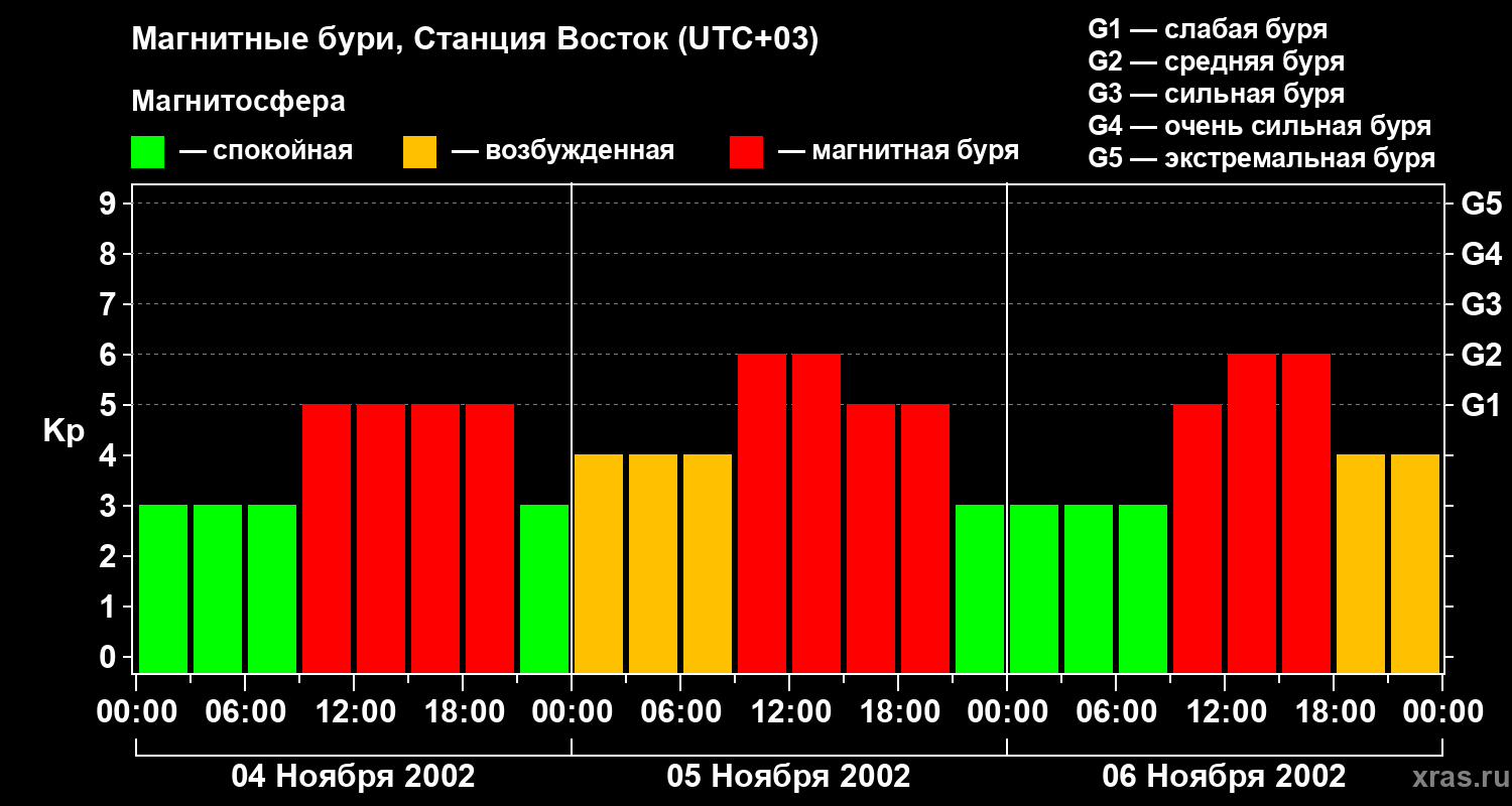 Изменения геомагнитного индекса Kp с 4 по 6 ноября 2002 года для высоких широт