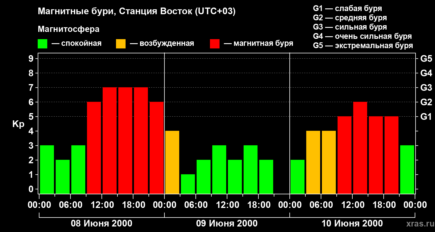Изменения геомагнитного индекса Kp с 8 по 10 июня 2000 года для высоких широт