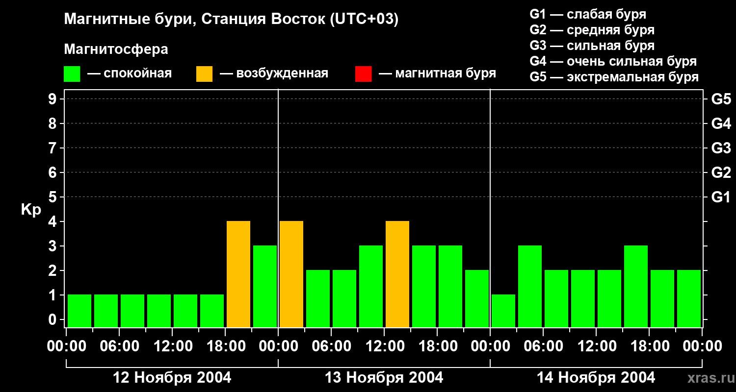 Изменения геомагнитного индекса Kp с 12 по 14 ноября 2004 года для высоких широт