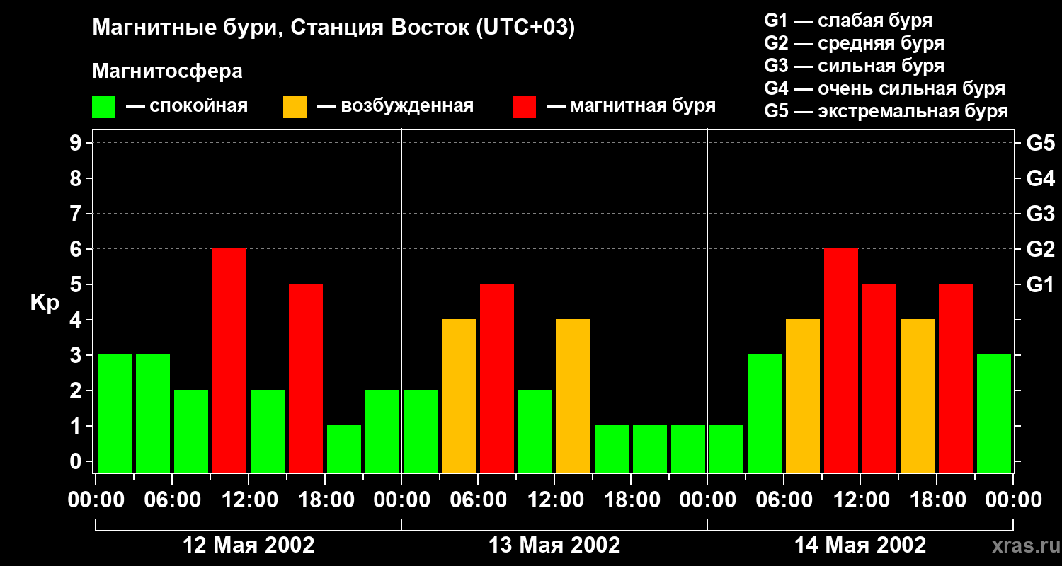 Изменения геомагнитного индекса Kp с 12 по 14 мая 2002 года для высоких широт