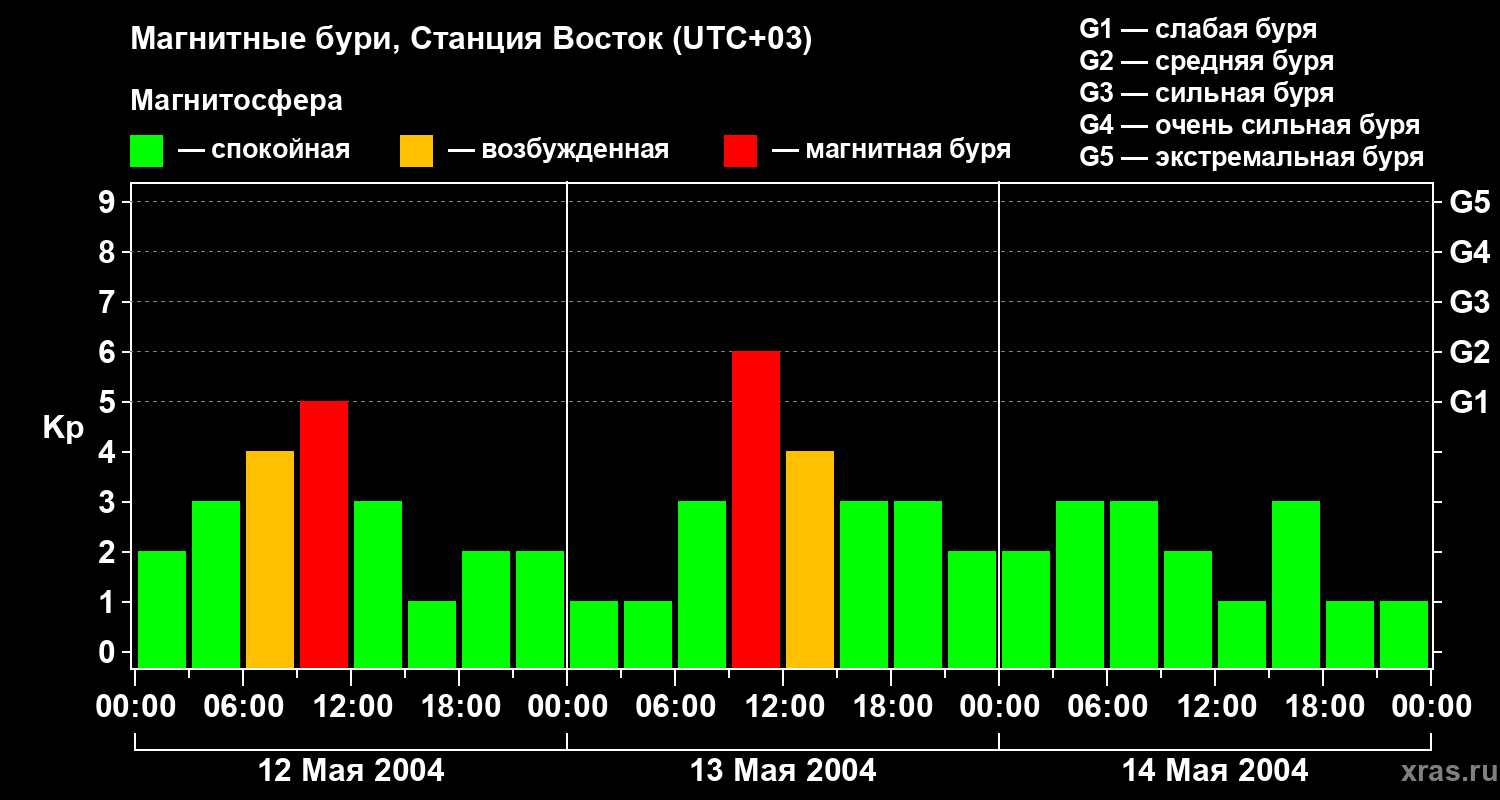 Изменения геомагнитного индекса Kp с 12 по 14 мая 2004 года для высоких широт