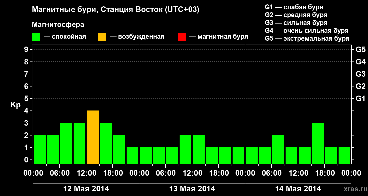 Изменения геомагнитного индекса Kp с 12 по 14 мая 2014 года для высоких широт