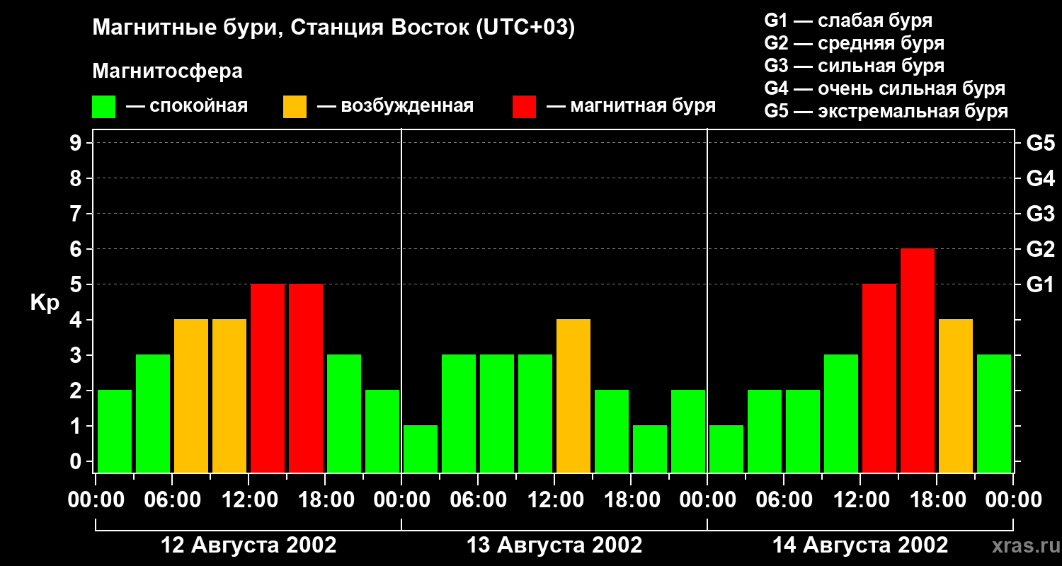 Изменения геомагнитного индекса Kp с 12 по 14 августа 2002 года для высоких широт