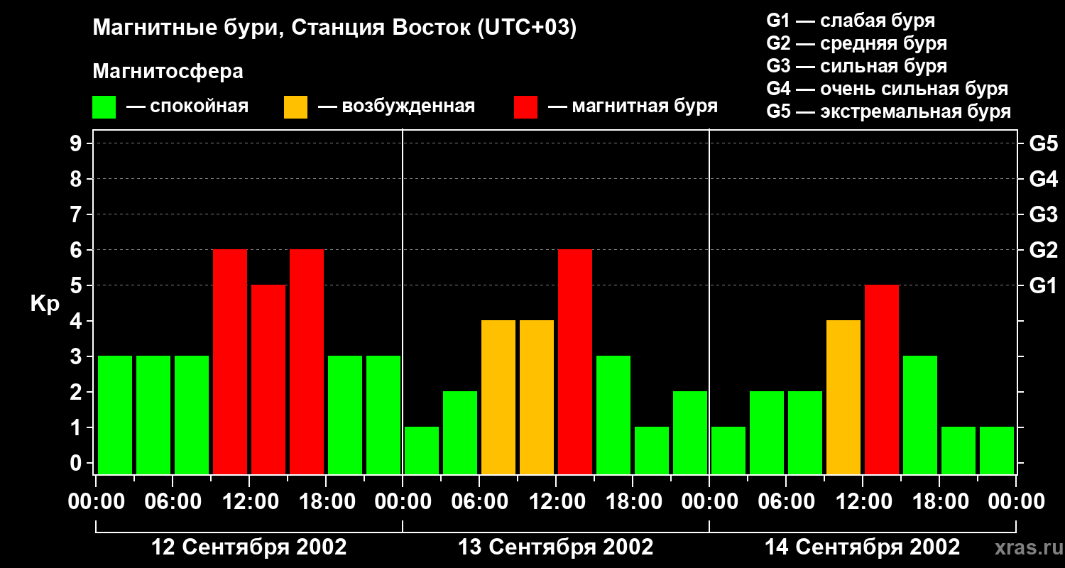 Изменения геомагнитного индекса Kp с 12 по 14 сентября 2002 года для высоких широт