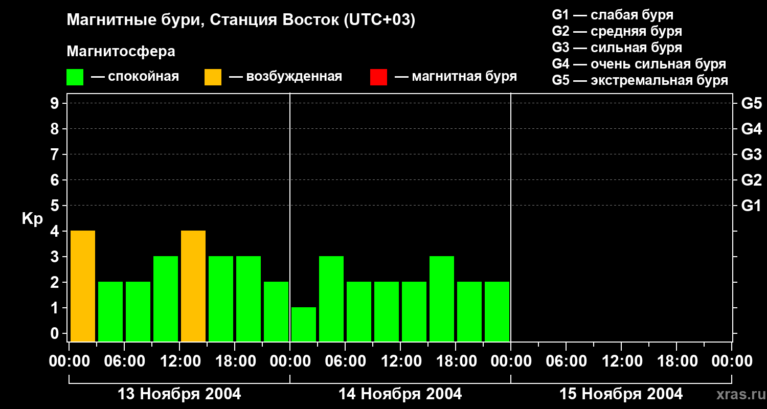 Изменения геомагнитного индекса Kp с 13 по 15 ноября 2004 года для высоких широт