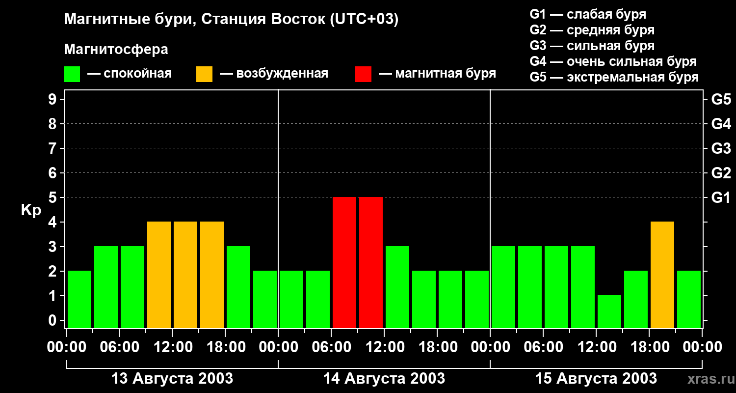 Изменения геомагнитного индекса Kp с 13 по 15 августа 2003 года для высоких широт