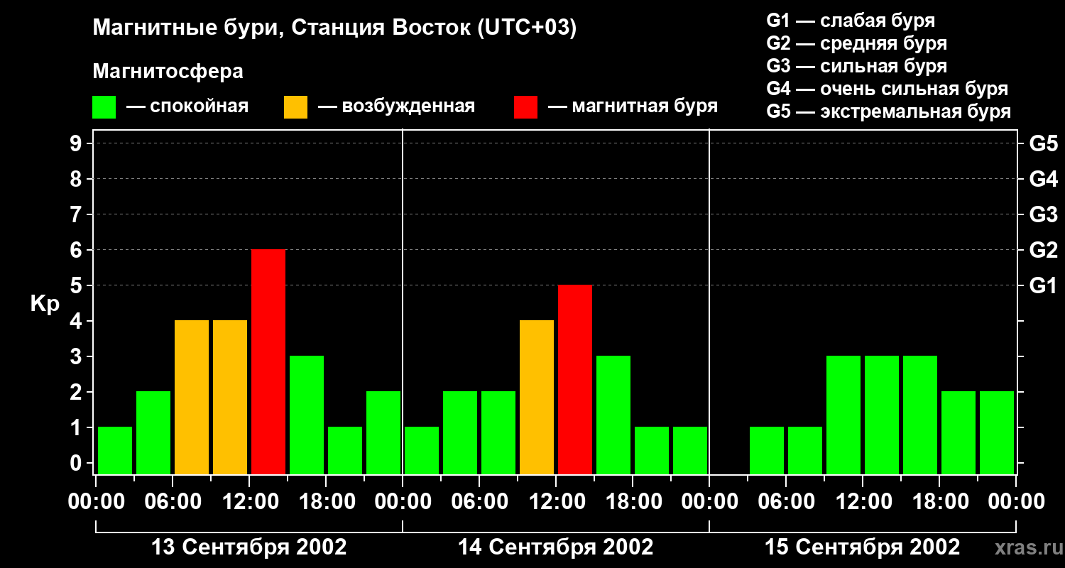 Изменения геомагнитного индекса Kp с 13 по 15 сентября 2002 года для высоких широт