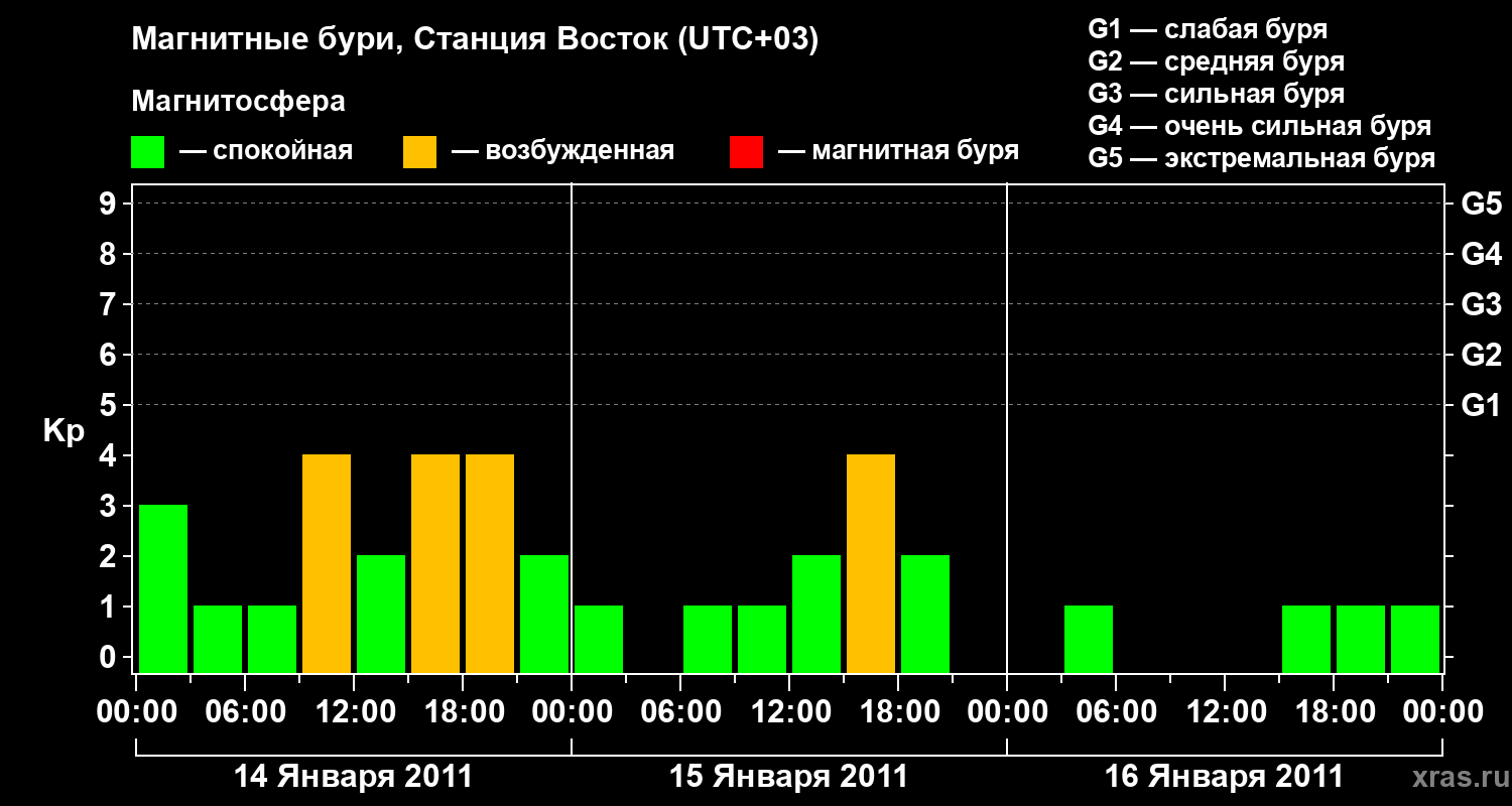 Изменения геомагнитного индекса Kp с 14 по 16 января 2011 года для высоких широт