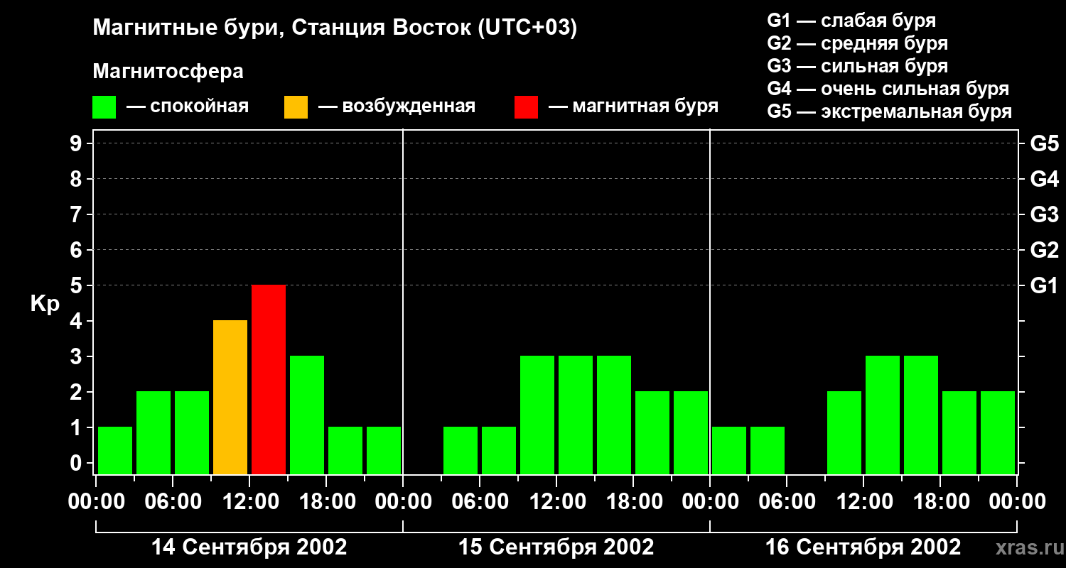 Изменения геомагнитного индекса Kp с 14 по 16 сентября 2002 года для высоких широт