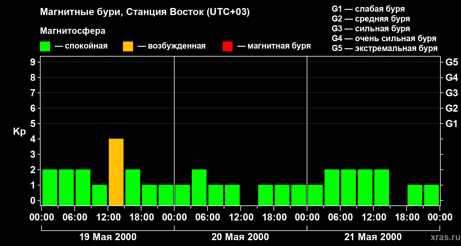 Изменения геомагнитного индекса Kp с 19 по 21 мая 2000 года для высоких широт