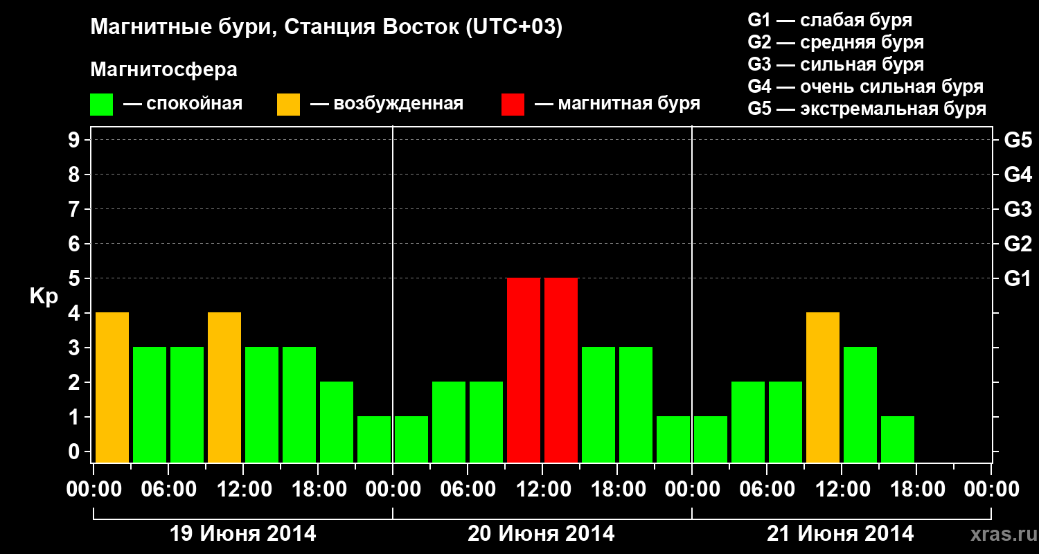 Изменения геомагнитного индекса Kp с 19 по 21 июня 2014 года для высоких широт