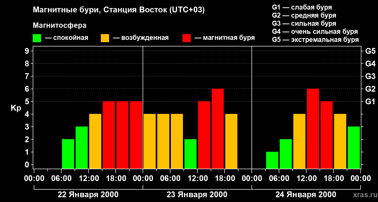 Изменения геомагнитного индекса Kp с 22 по 24 января 2000 года для высоких широт
