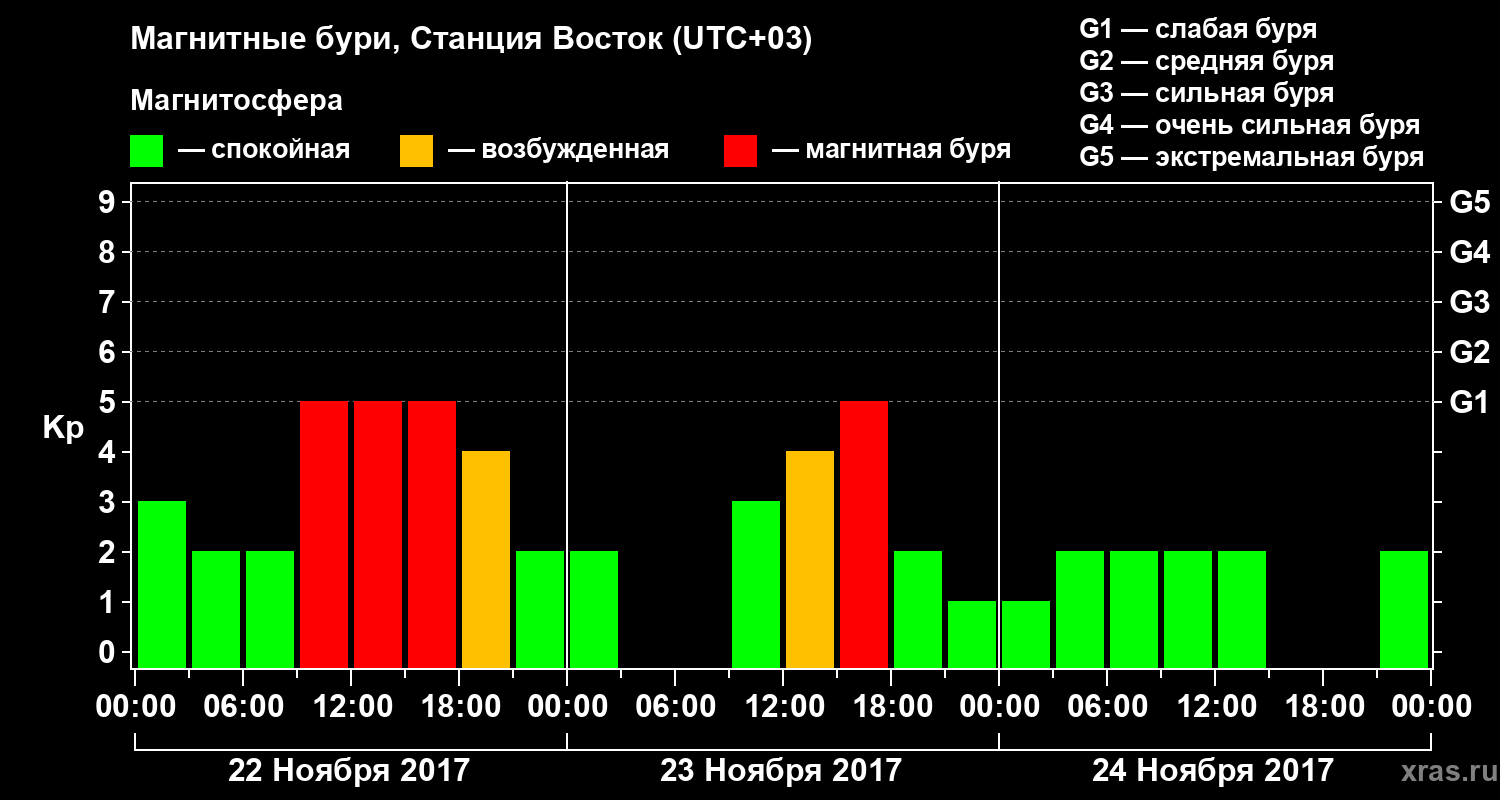 Изменения геомагнитного индекса Kp с 22 по 24 ноября 2017 года для высоких широт