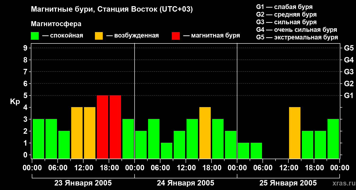 Изменения геомагнитного индекса Kp с 23 по 25 января 2005 года для высоких широт