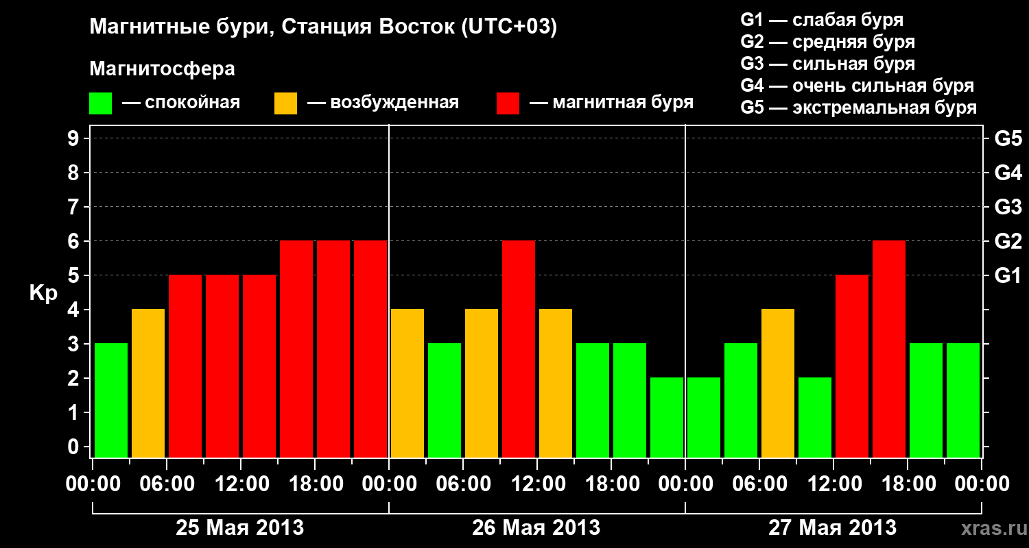 Изменения геомагнитного индекса Kp с 25 по 27 мая 2013 года для высоких широт