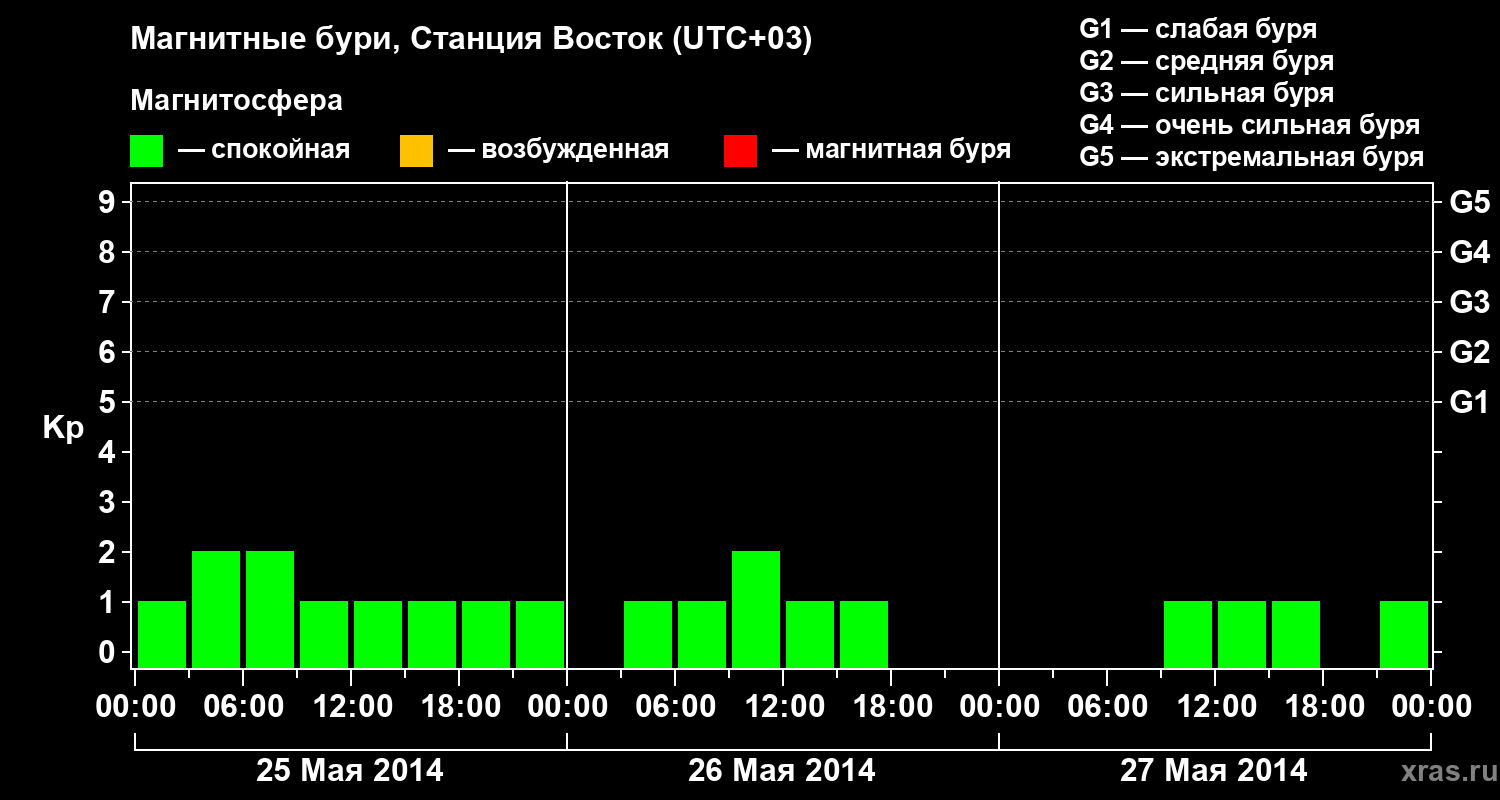 Изменения геомагнитного индекса Kp с 25 по 27 мая 2014 года для высоких широт