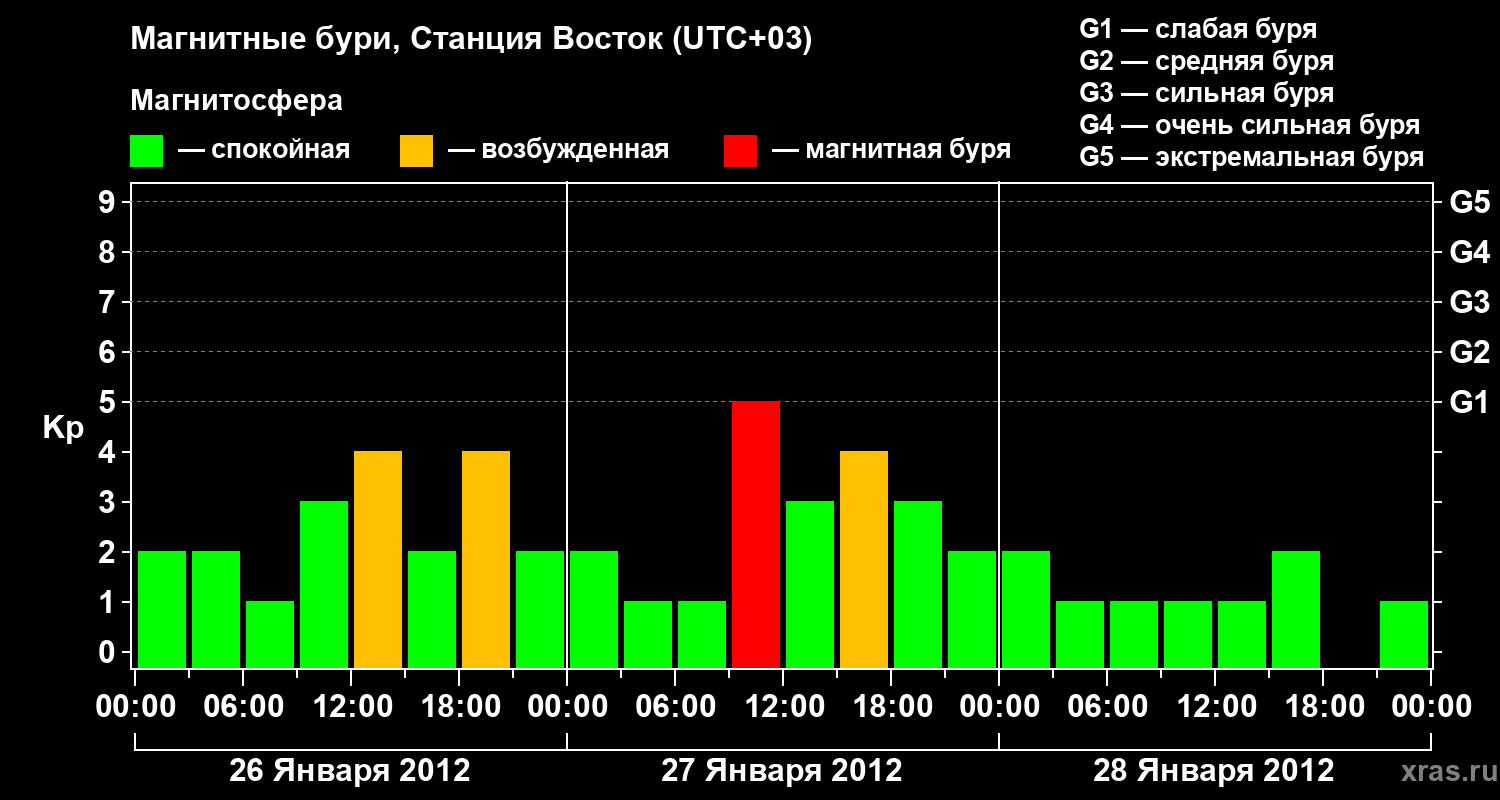 Изменения геомагнитного индекса Kp с 26 по 28 января 2012 года для высоких широт