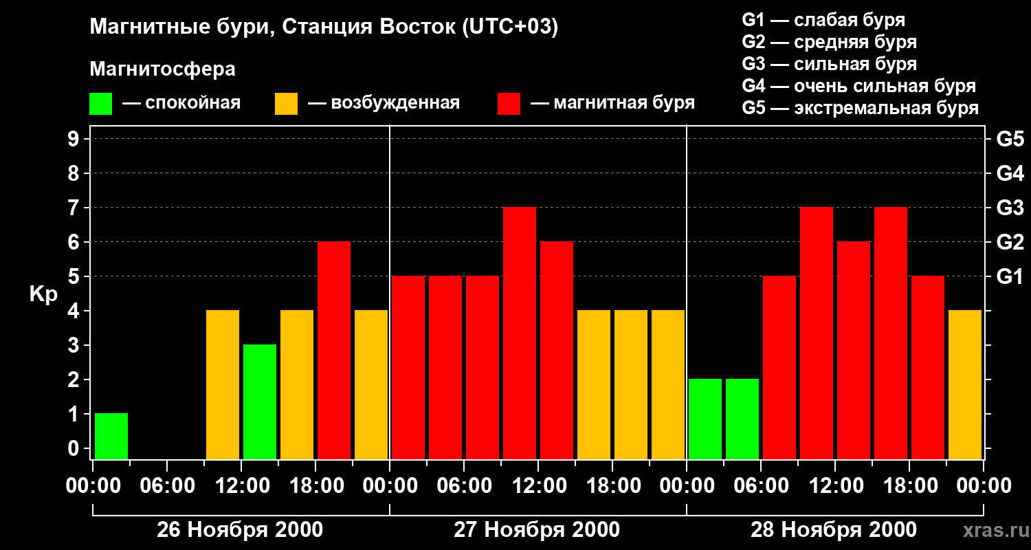Изменения геомагнитного индекса Kp с 26 по 28 ноября 2000 года для высоких широт