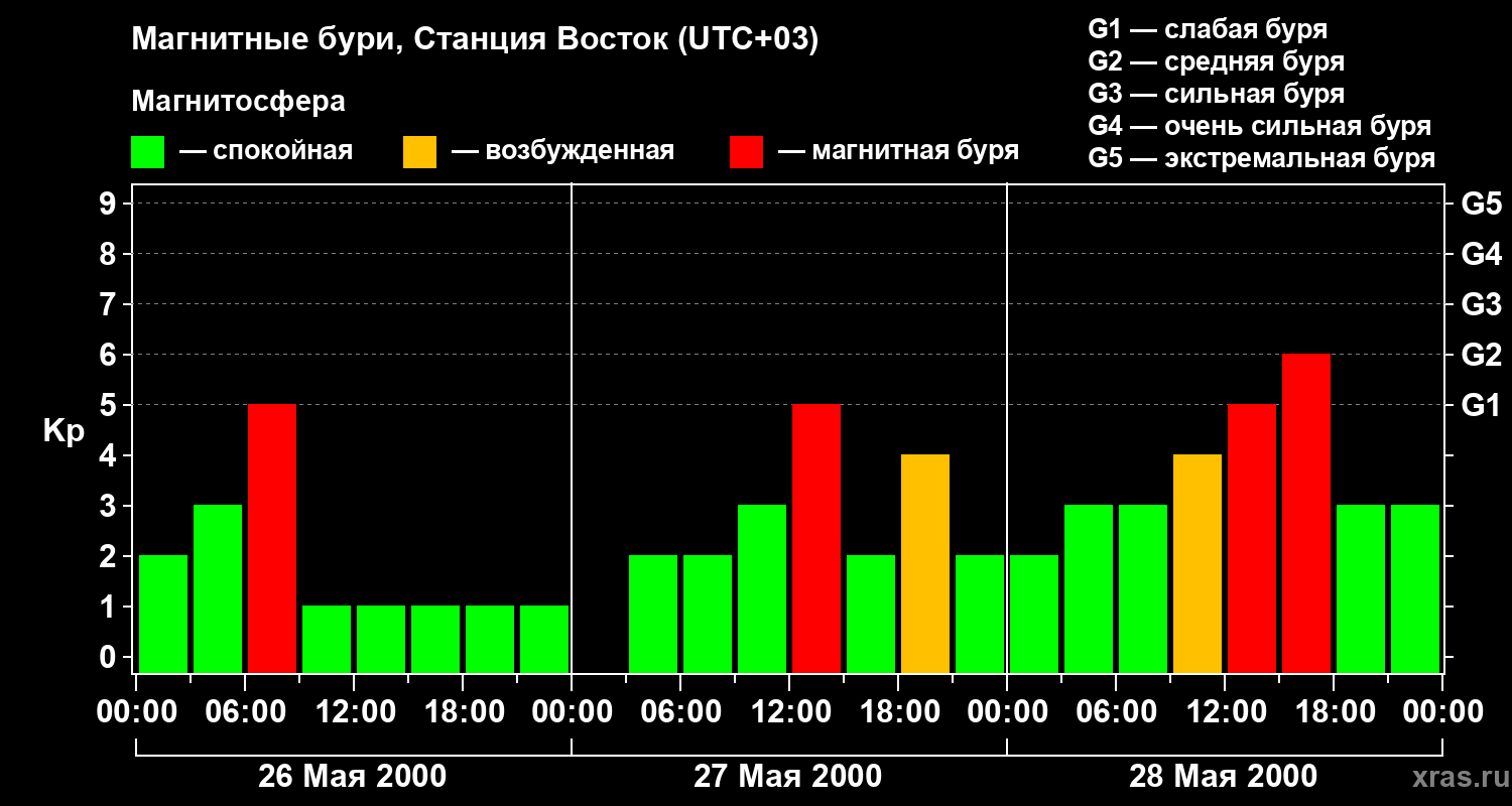 Изменения геомагнитного индекса Kp с 26 по 28 мая 2000 года для высоких широт