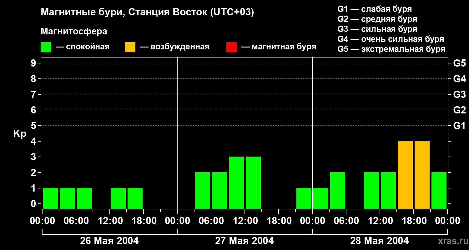 Изменения геомагнитного индекса Kp с 26 по 28 мая 2004 года для высоких широт