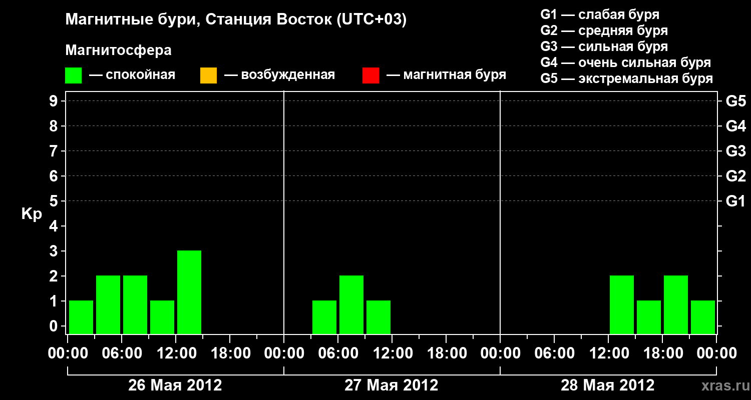 Изменения геомагнитного индекса Kp с 26 по 28 мая 2012 года для высоких широт