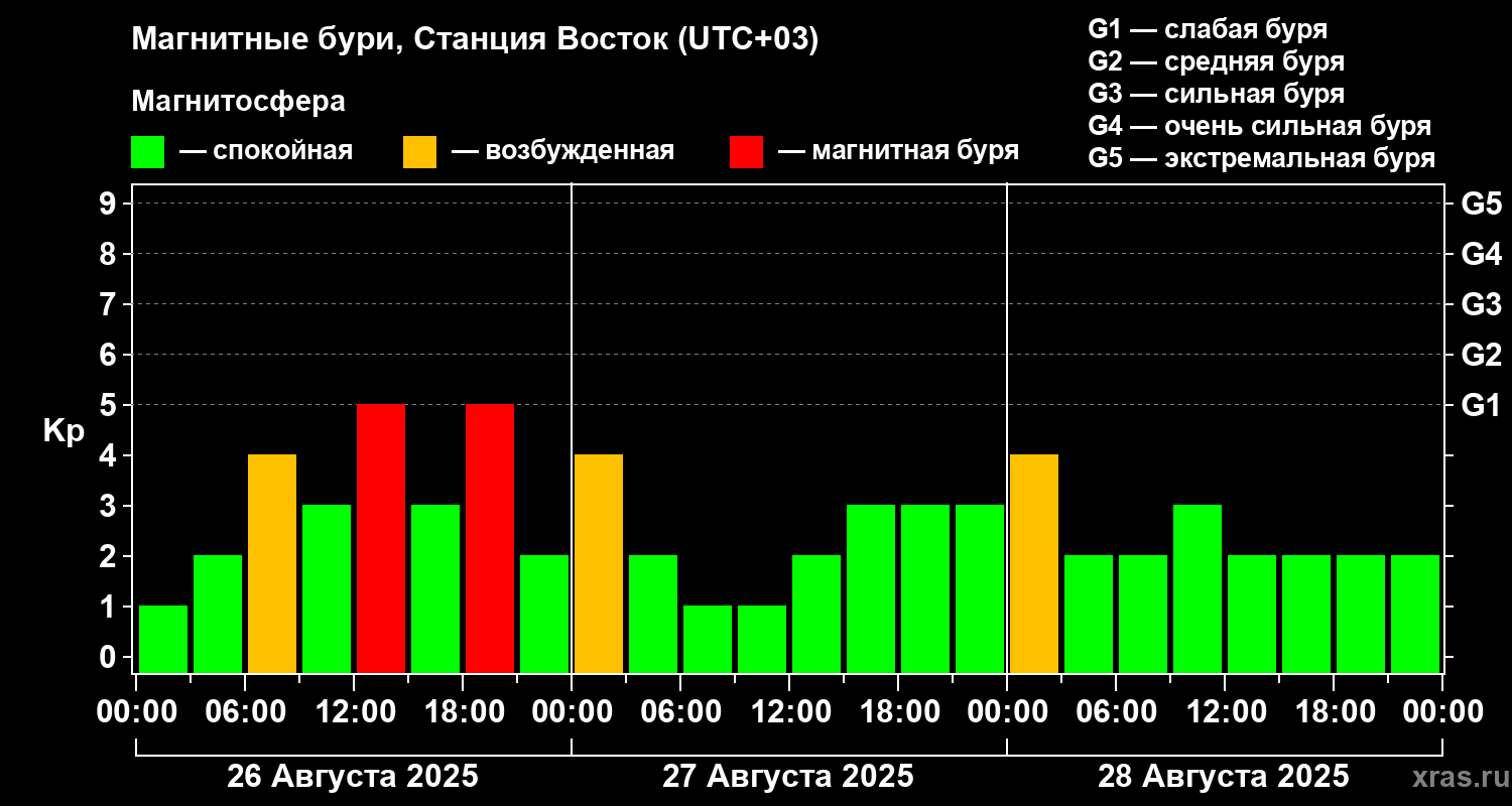 Изменения геомагнитного индекса Kp с 26 по 28 августа 2025 года для высоких широт