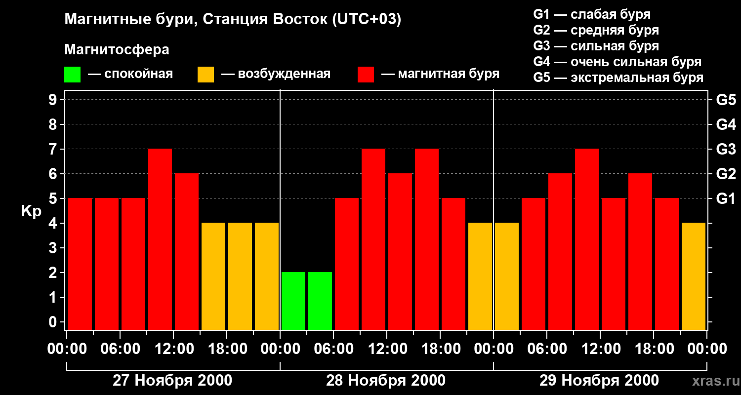 Изменения геомагнитного индекса Kp с 27 по 29 ноября 2000 года для высоких широт
