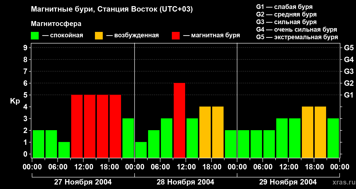 Изменения геомагнитного индекса Kp с 27 по 29 ноября 2004 года для высоких широт