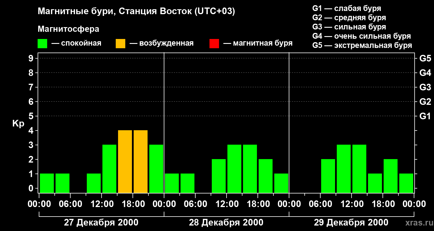 Изменения геомагнитного индекса Kp с 27 по 29 декабря 2000 года для высоких широт