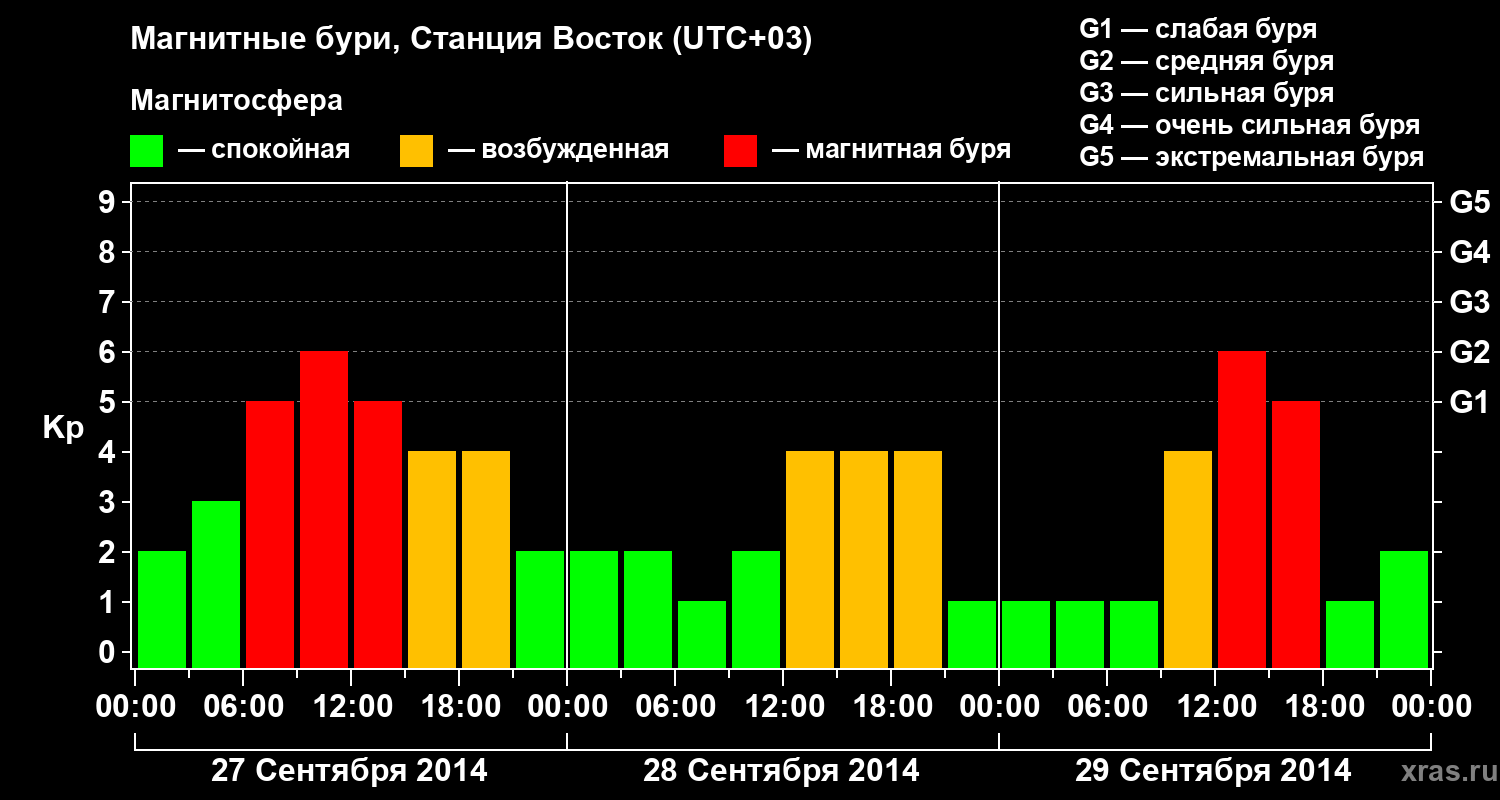 Изменения геомагнитного индекса Kp с 27 по 29 сентября 2014 года для высоких широт
