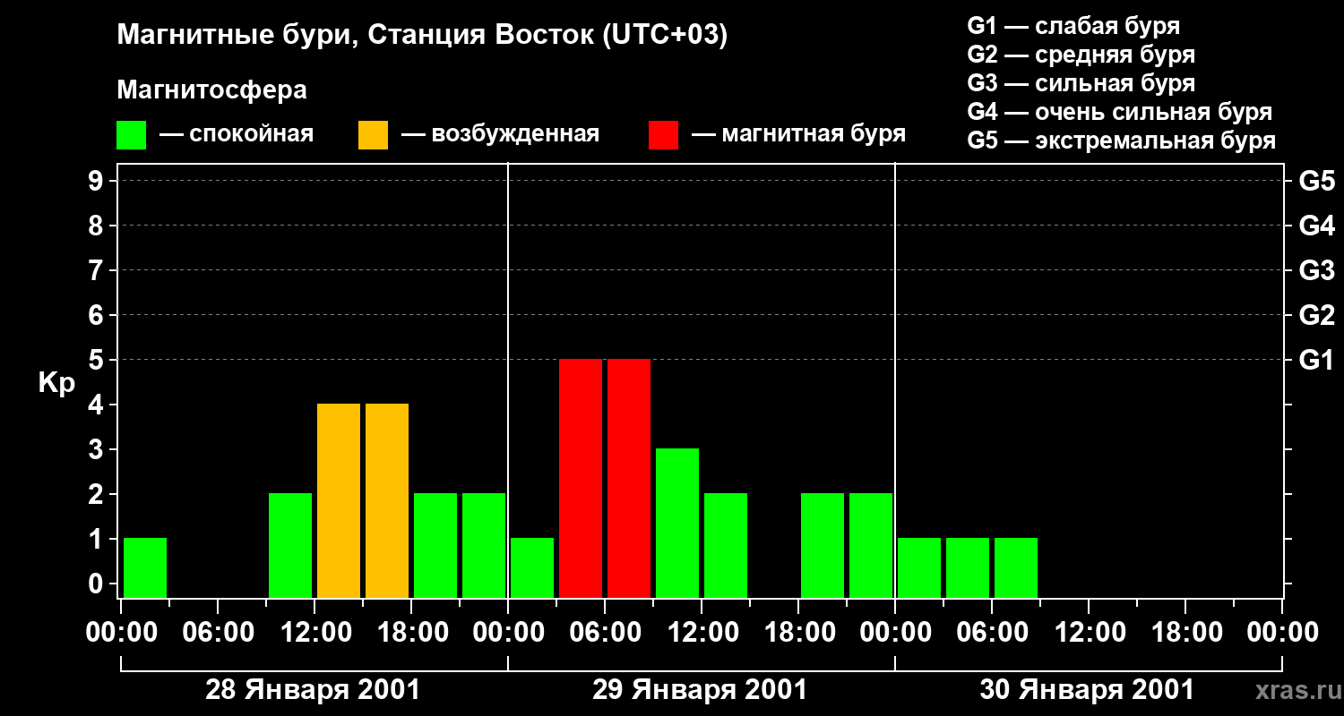 Изменения геомагнитного индекса Kp с 28 по 30 января 2001 года для высоких широт