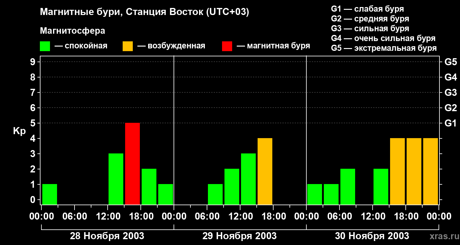 Изменения геомагнитного индекса Kp с 28 по 30 ноября 2003 года для высоких широт