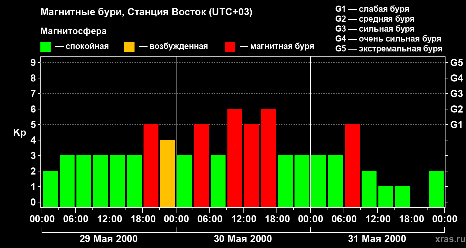 Изменения геомагнитного индекса Kp с 29 по 31 мая 2000 года для высоких широт
