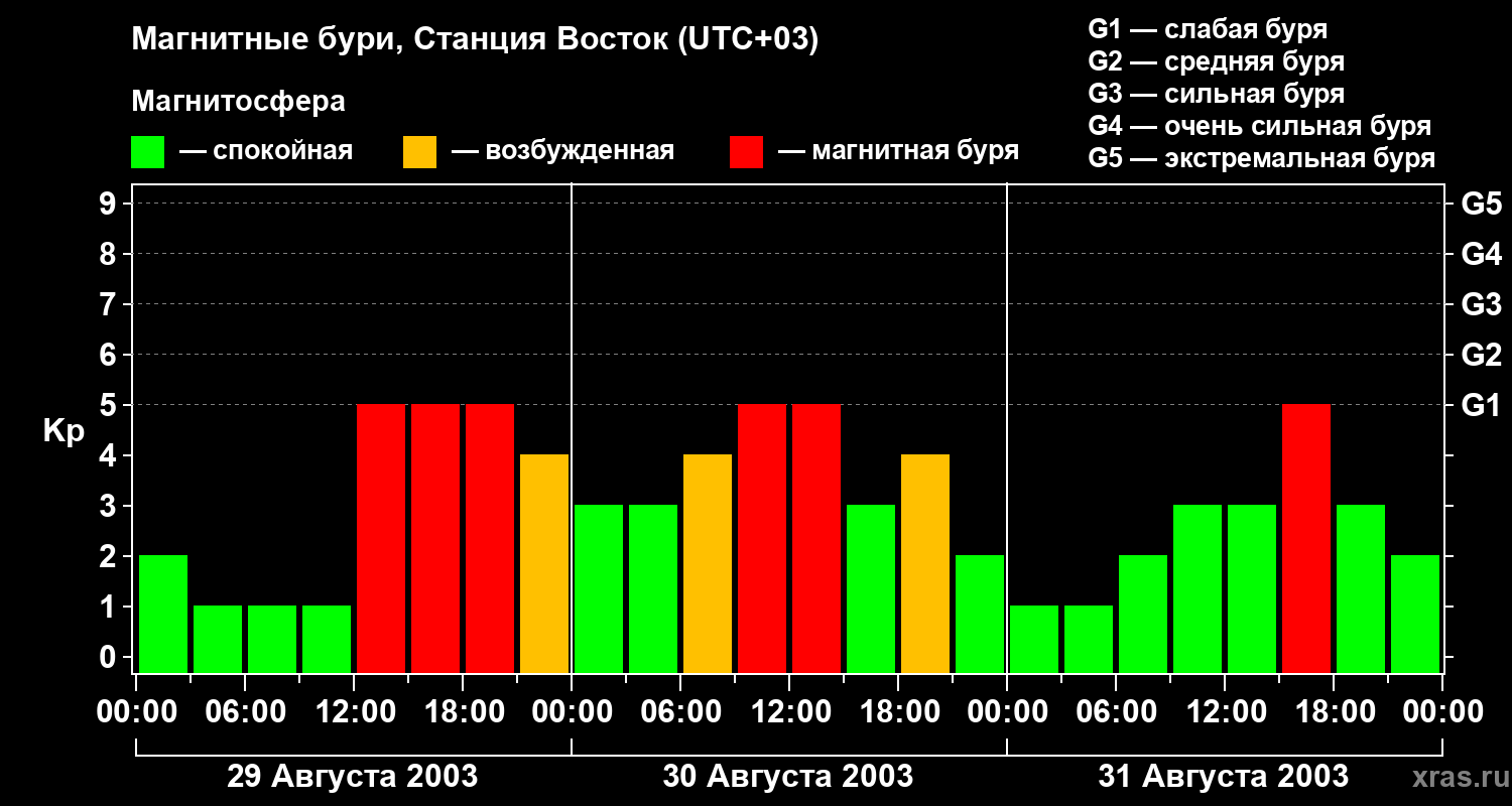 Изменения геомагнитного индекса Kp с 29 по 31 августа 2003 года для высоких широт
