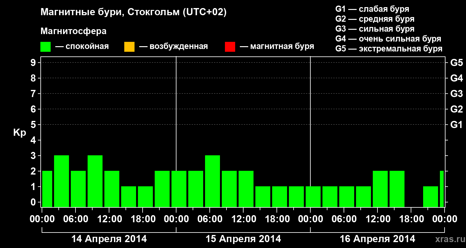 Изменения геомагнитного индекса Kp с 14 по 16 апреля 2014 года для средних широт