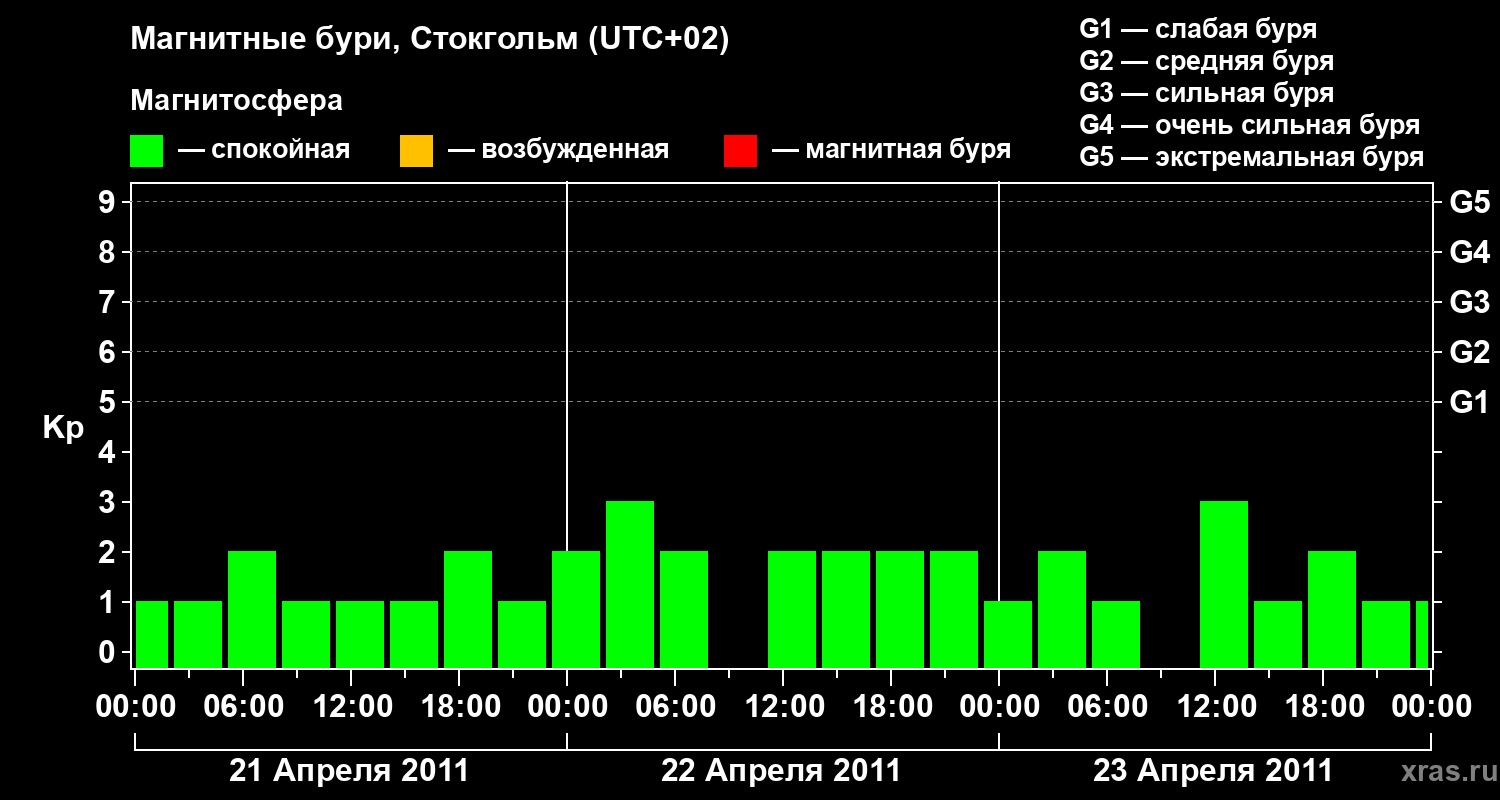 Изменения геомагнитного индекса Kp с 21 по 23 апреля 2011 года для средних широт